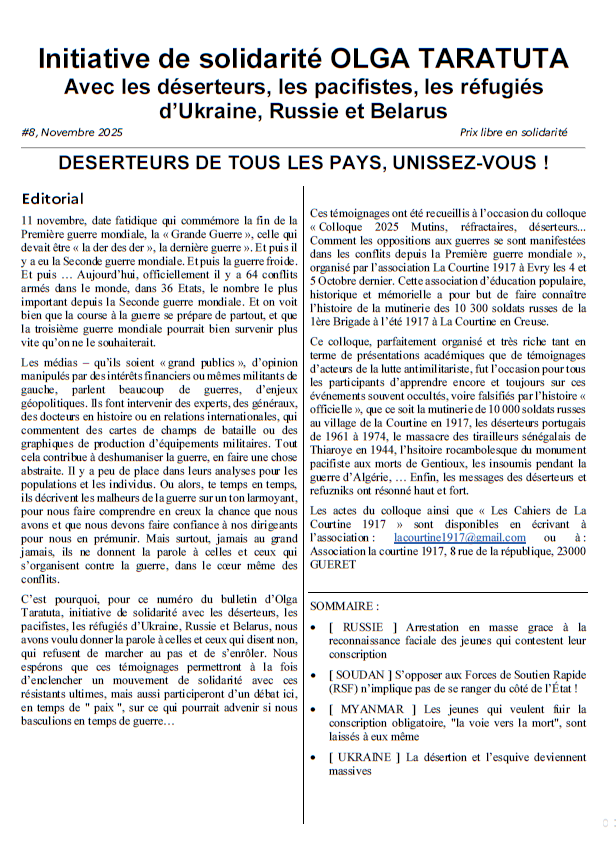The French group The Network of Anarchist Internationalist “l’Initiative de solidarité Olga Taratuta” has published the eighth issue of its newsletter: “Bulletin #8 de l’Initiative Olga Taratuta] Russia, Ukraine, Sudan, Myanmar: deserters of all countries, unite!” It is available for free download on the group’s website: https://nowar.solidarite.online/blog/bulletin-8-de-linitiative-olga-taratuta-russie-ukraine-soudan-myanmar-d%C3%A9serteurs-de-tous-les-pays-unissez-vous?fbclid=IwY2xjawPNnoBleHRuA2FlbQIxMQBzcnRjBmFwcF9pZBAyMjIwMzkxNzg4MjAwODkyAAEeFbodhjrf0i-Bk0p1VTDdh9lV0UgULDXKRrFlvA46TJaLXy7d7cAjWmIu2tM_aem_x69tUnp3ZWoBaDCAzFVlNg